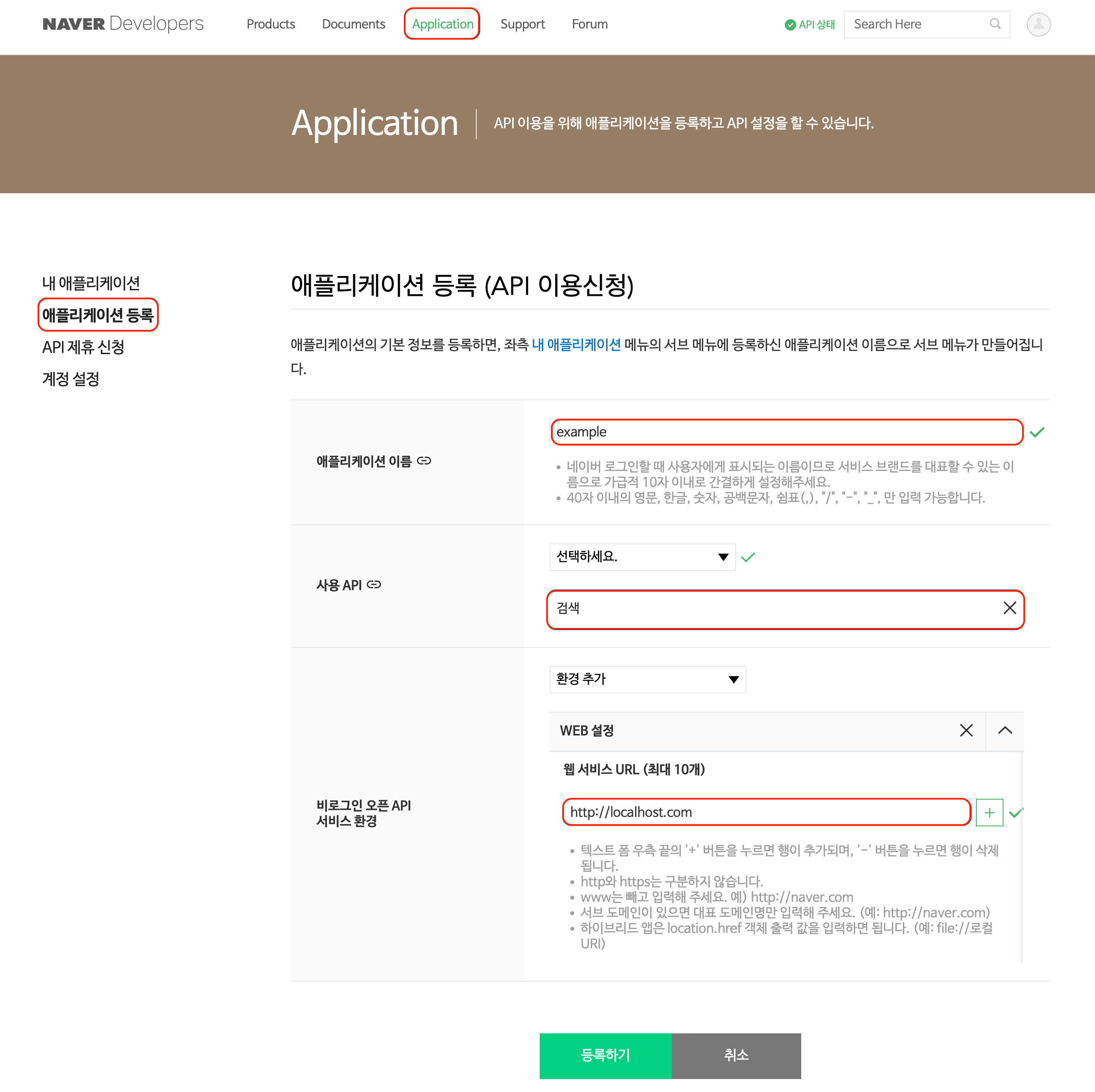 ๐ ๋ค์ด๋ฒ ๊ฐ๋ฐ์ ์ผํฐ ๋ก๊ทธ์ธ > Application > ์ ํ๋ฆฌ์ผ์ด์ ๋ฑ๋ก