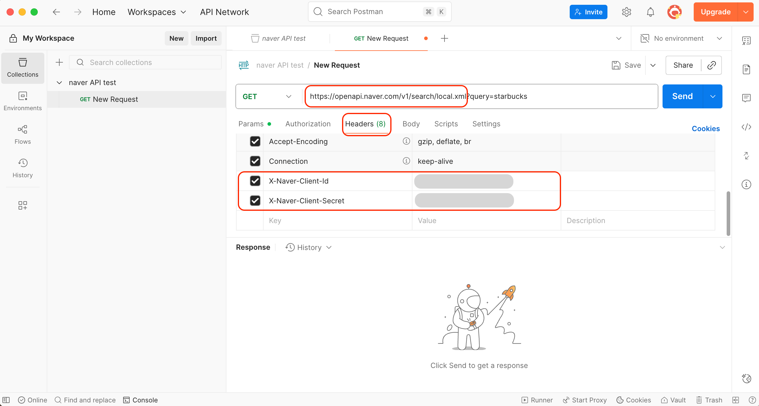 Naver Open API URL์ ์ ๋ ฅํ๊ณ , Headers์ Client ID์ Client Secret์ ์ ๋ ฅํ๋ค